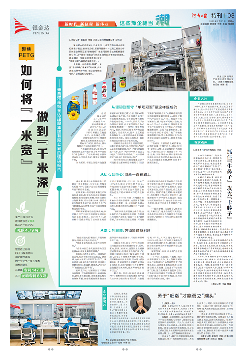 闫银凤:企业一定要找准自己的发展方向,建立国际化的视野和标准,不要东张西望,看什么赚钱做什么。企业起步之初,我确立了“在阳光下做生意”这个理念,以诚信为本,不掺假、不作假。发展的第二阶段,凯发提出“科技创业”理念,决定花大力气研发PETG。十几年时间里,从实验室研发到实现产业化,企业不止一次经历了“死亡之谷”“至暗时刻”,但凯发始终坚信企业的发展定位和努力方向,始终坚定“再难也要自己干”的决心,始终坚持集聚一切资源和力量不断向前,才会“力出一孔,穿破堡垒”,取得最终的成功。